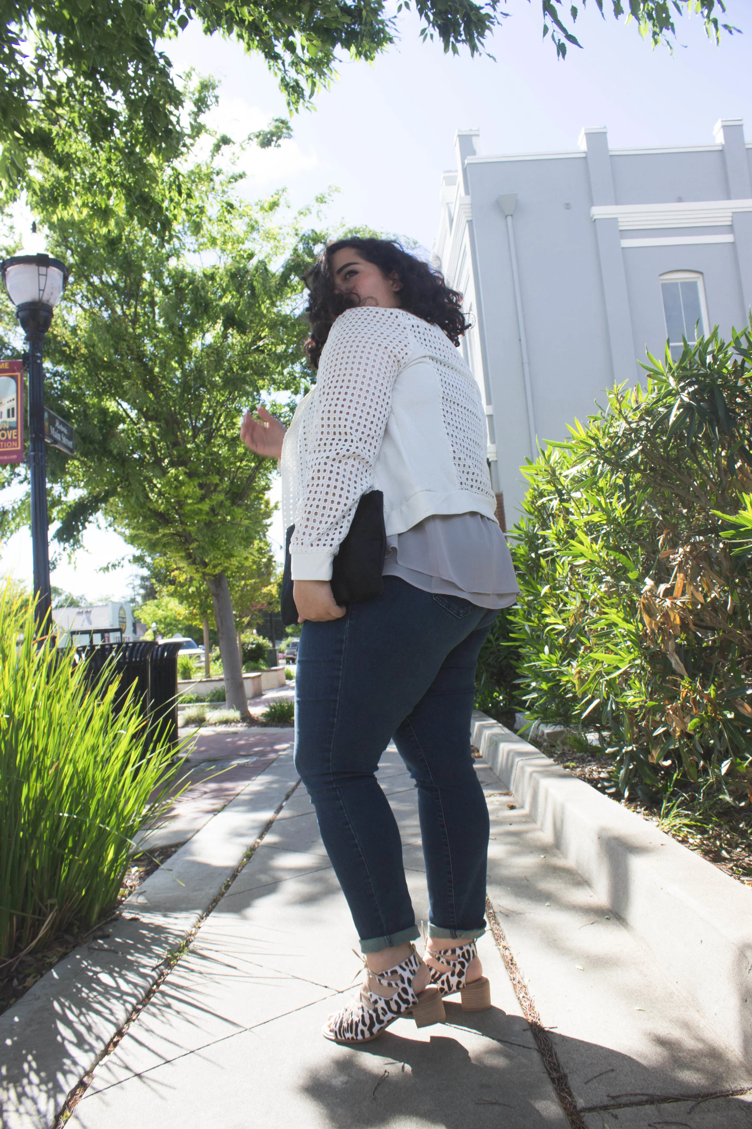 Springtime is the perfect time to layer the lighter pieces in your closet. When I saw this eyelet bomber jacket on the Torrid site, I immediately said “I need you in my life. Stat.” Anything eyelet is a staple for Spring and Summer. Put it on a bomber jacket and I am sold. Perfect for the light layering that I mentioned. I could easily wear this jacket on top of a long sleeve top along with a midi skirt, but I opted to pair it with this chiffon cami. I loved that the cami was double-layered because it made it non-see through. Pairing the cami and bomber jacket together was a match made in heaven because not only was the fit on point, but it was light and airy. Speaking of the fit, I was on cloud nine when I tried everything from Torrid on because every item fit me like a glove. These jeans, in particular, are like a little hug for my body. They’re high-waisted and accentuate your body in all the right places. You’ve probably noticed that a style preference of mine is to cuff my jeans. Sometimes cuffing a certain pair of jeans doesn’t look good, but I loved how it looked on these dark wash jeans. Now, my favorite part: SHOES. These leopard print calf hair block heels are, in my opinion, the most approachable way to wear animal print in the spring and summer. You guys will be seeing them a lot! I’ve also told you guys that I have wide feet so I was thrilled to see that the fit on these were wide. I finished this look off by pairing it with this calf hair black clutch that is a staple item for any closet, any season.