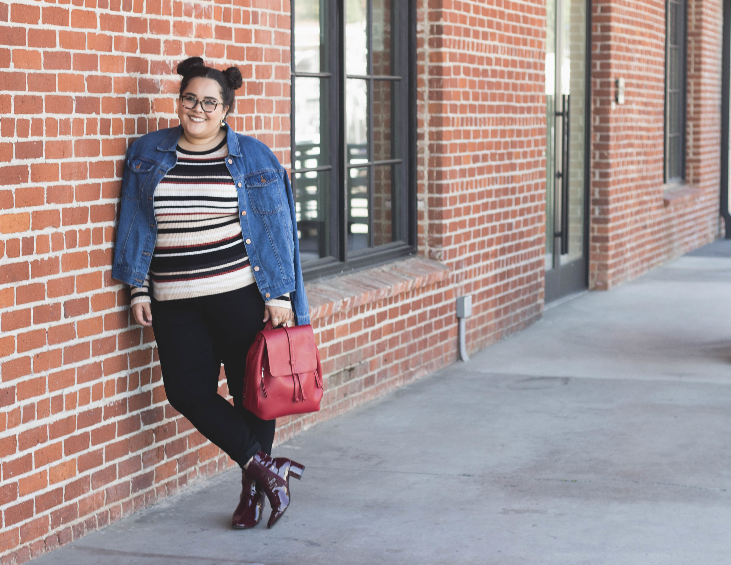 I am so, so, so in love with these patent boots and leather backpack. Even though they aren't matching when it comes to shades of what I would call red, they work in perfect harmony with the sweater's multiple berry-like colors. I was promoted by my best friend, who also slayed these photos (Shoutout to her!), to mix the colors together because they still worked so well together. And, I am so glad I took her advice because the color combination is so unpredictably kickass.